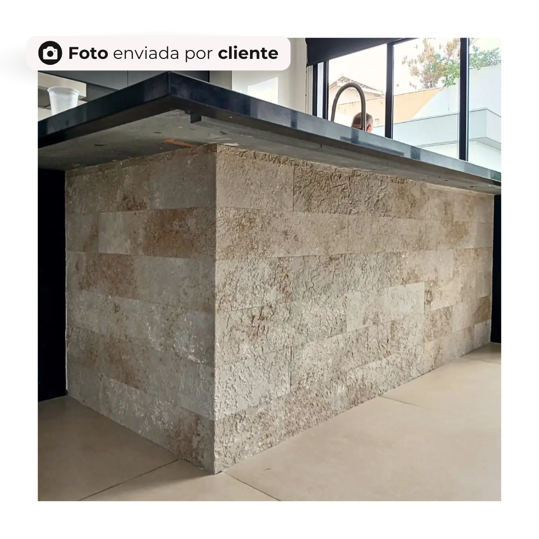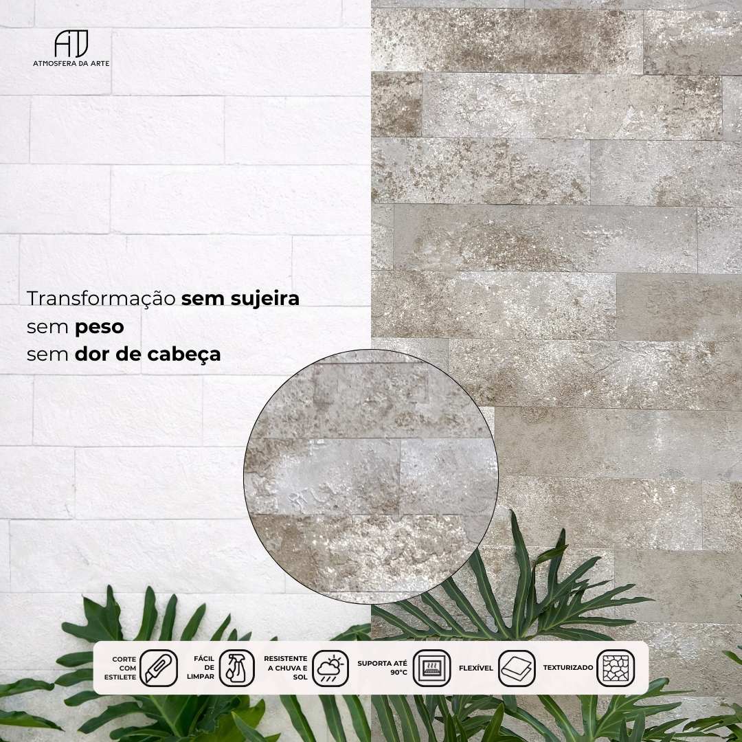 O revestimento autocolante Brick Rockface combina a praticidade do formato tijolinho com a sofisticação da pedra natural. Com bastante textura e nuances que variam entre fendi, bege e acinzentado, cada peça é produzida artesanalmente em pedra natural adesiva, garantindo autenticidade e resistência.