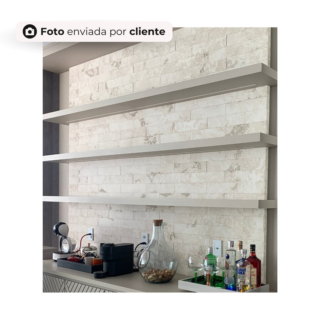 Revestimento autocolante Brick Travertino em tons suaves de bege e branco, produzido artesanalmente em pedra natural adesiva de base mineral. Cada tijolinho adesivo de travertino combina elegância, sofisticação e a textura autêntica do travertino, trazendo luxo clássico e harmonia para qualquer ambiente.