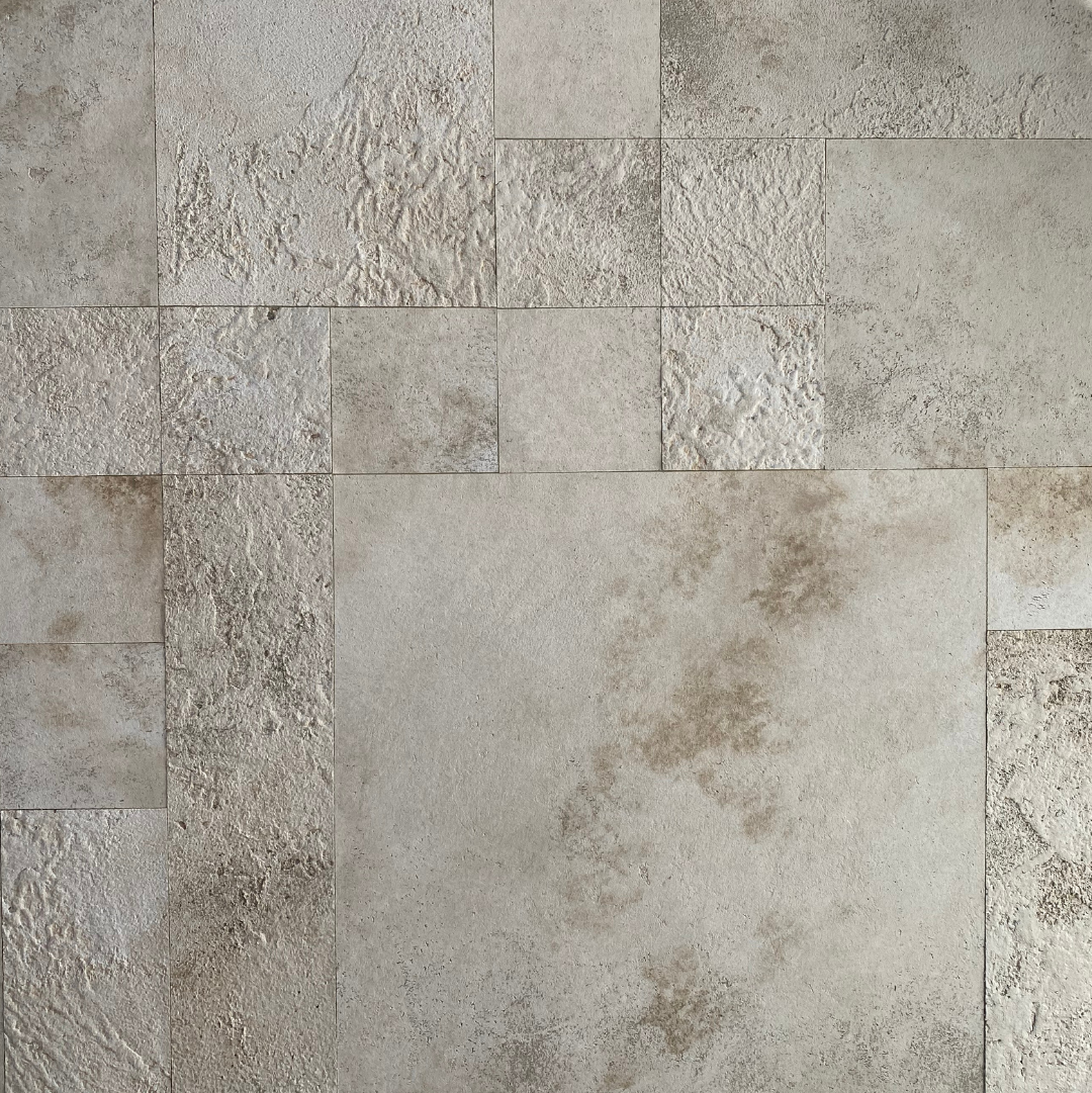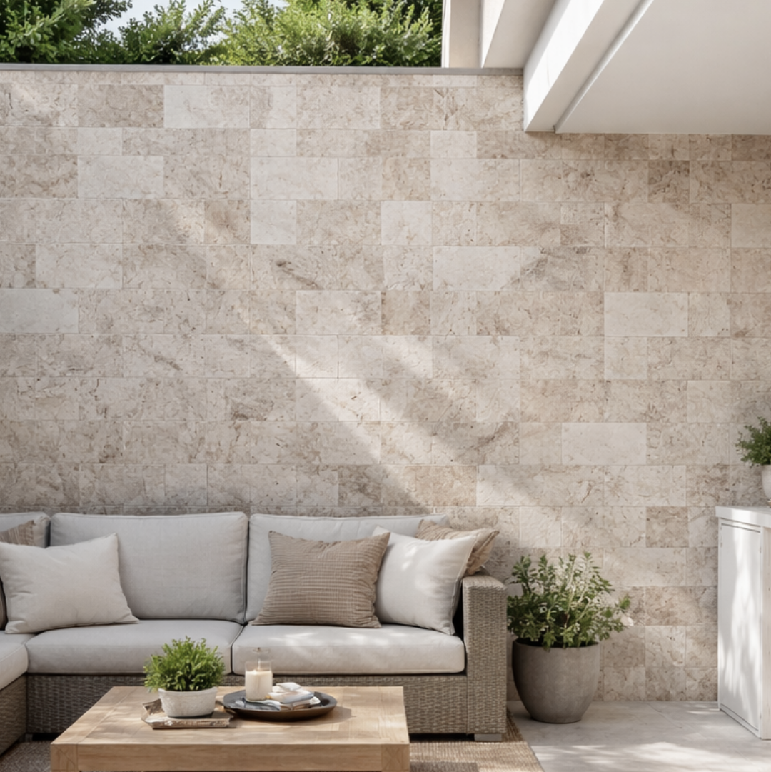 Revestimento autocolante Mosaico Travertino em tons sofisticados de creme e bege, produzido artesanalmente em pedra natural adesiva de rocha calcária. Este revestimento combina beleza, praticidade e durabilidade em uma única peça.